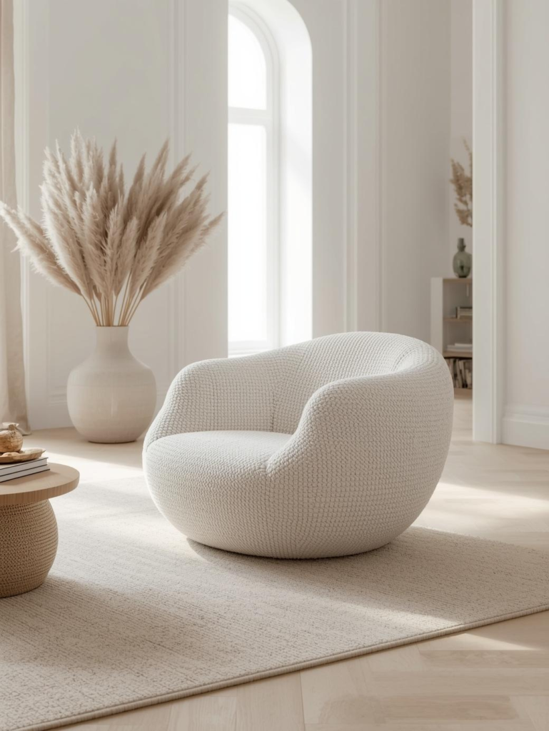 Bouclé fabric adds texture that instantly makes a room feel layered and expensive. Pair the chair with a small side table, pampas grass, and warm lighting for a trendy setup. This chair style works beautifully in apartments, bedrooms, and modern living rooms where softness and comfort are priorities in 2026 decor trends.