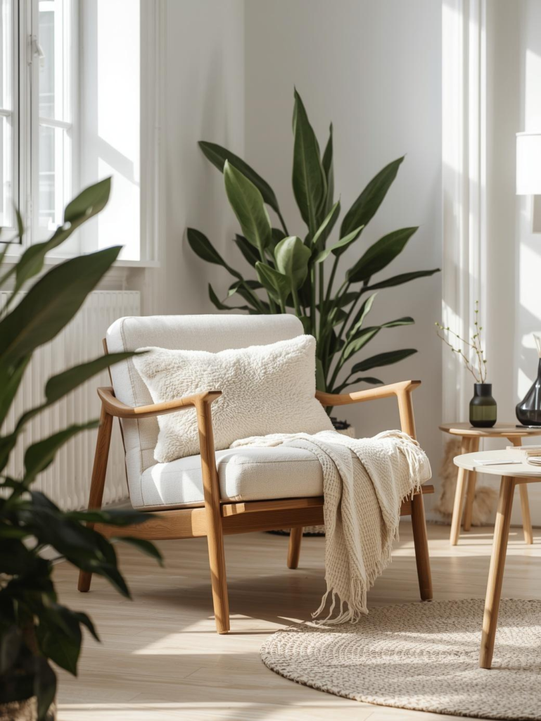 To keep the room inviting, layer soft textures around the chair like rugs, throws, and natural wood furniture. White chairs pair beautifully with beige, sage green, and black accents. This timeless look remains a favorite among Pinterest users in 2026.