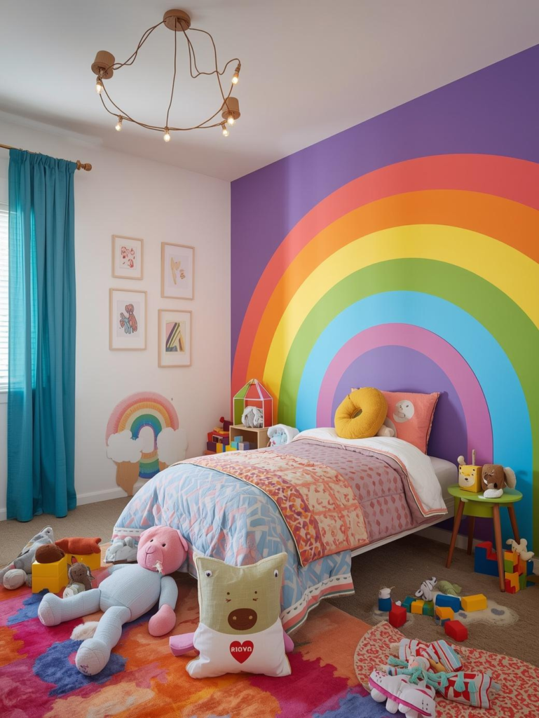 A rainbow accent wall instantly brings energy and happiness into a child’s bedroom. Using soft blended tones or bold stripes, this feature wall becomes the focal point of the space. It creates a cheerful environment that encourages creativity and positivity every day.