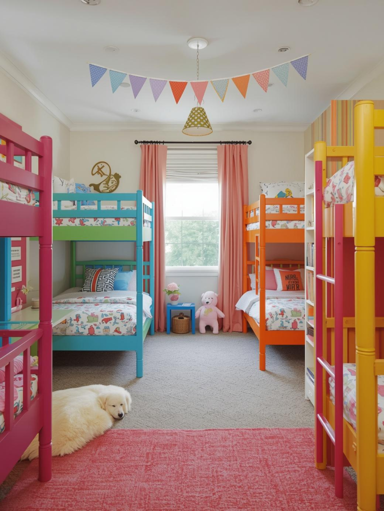 Colorful bunk beds are both practical and fun, especially for shared spaces. Painting the beds in vibrant shades like blue, yellow, or green adds personality while saving space. It turns a functional piece into a playful centerpiece.