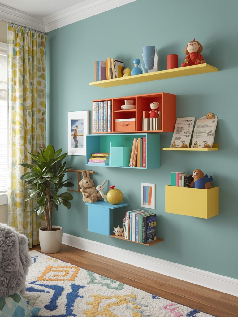 Colorful shelves are both decorative and functional. They provide space for books, toys, and decor while adding vibrant accents to the walls.