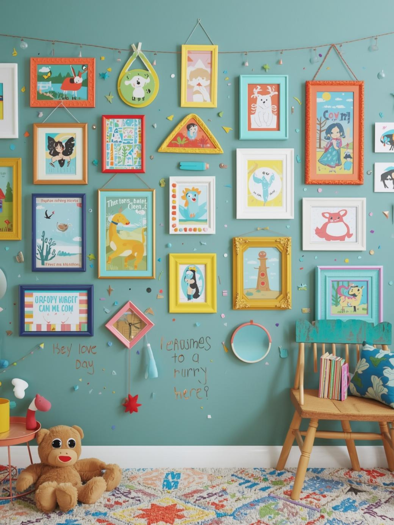 Use bright frames or mismatched styles for a playful vibe. This idea makes the room feel personal and lively while encouraging artistic expression.