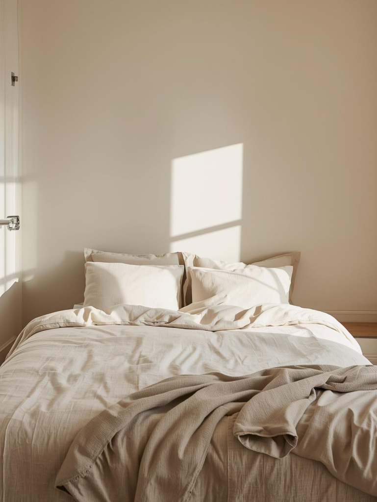 This soft beige bedroom focuses on calm and simplicity with layered neutral tones and clean design. Beige walls paired with creamy white bedding create a peaceful atmosphere that feels warm and inviting. Minimal decor keeps the space clutter-free, making it perfect for relaxation and stress-free living in a modern home setting.