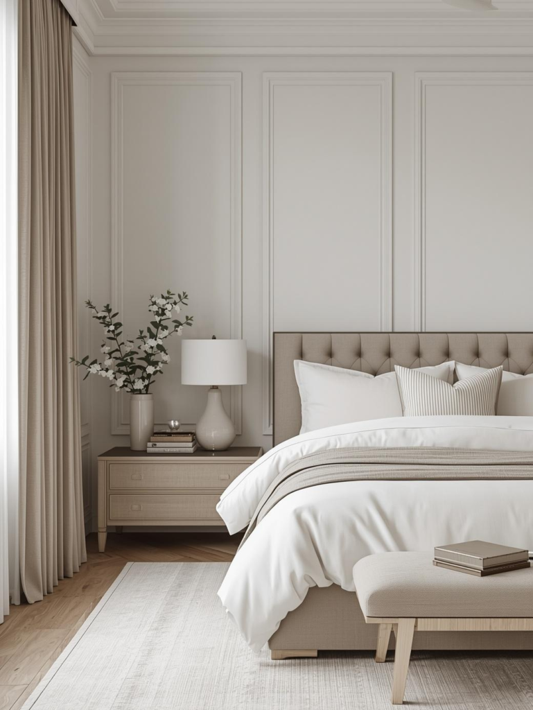 14. Soft Taupe & White Elegant Bedroom