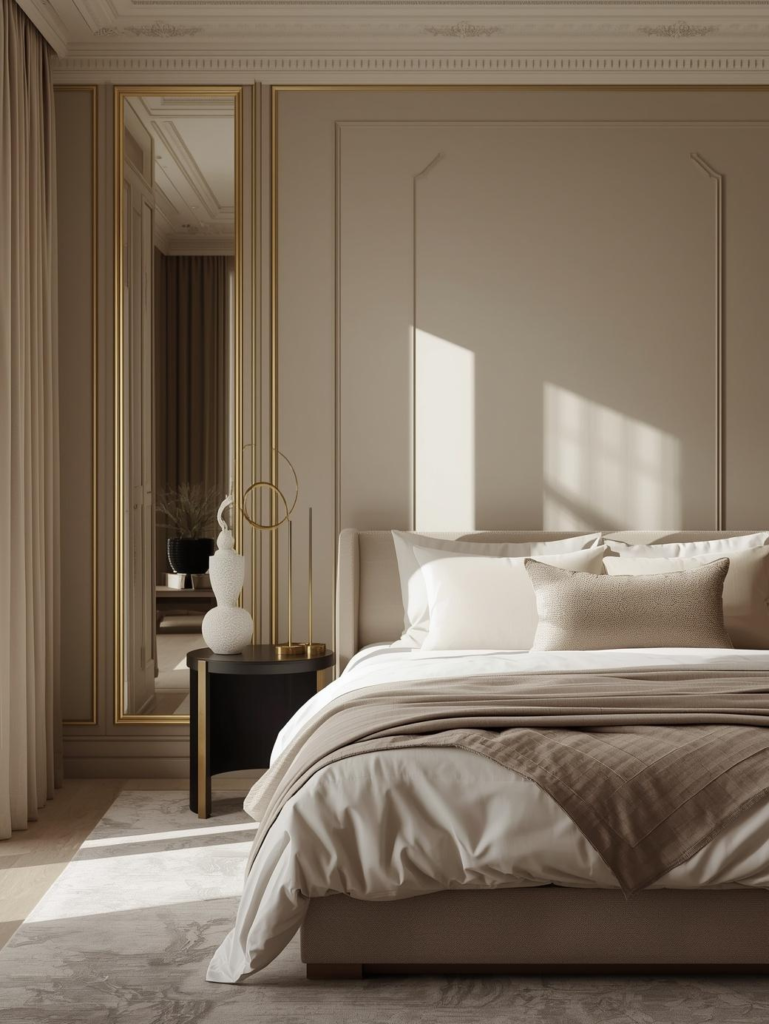 Gold lamps, mirrors, and decor pieces elevate the space without overpowering the calm neutral base. The result is a sophisticated bedroom that feels glamorous yet soothing.