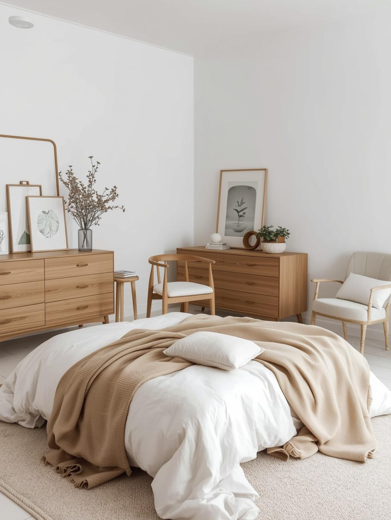 Scandinavian bedrooms focus on simplicity, functionality, and soft neutral tones. White walls combined with light wood furniture create a fresh and calming environment. This style is perfect for small spaces because it enhances brightness and openness.