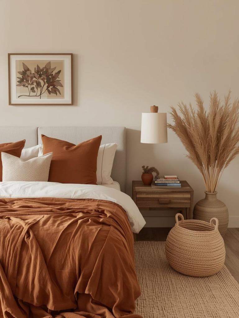 Wood accents and soft textiles complete the warm aesthetic. It’s perfect for a relaxing and nature-inspired space.
