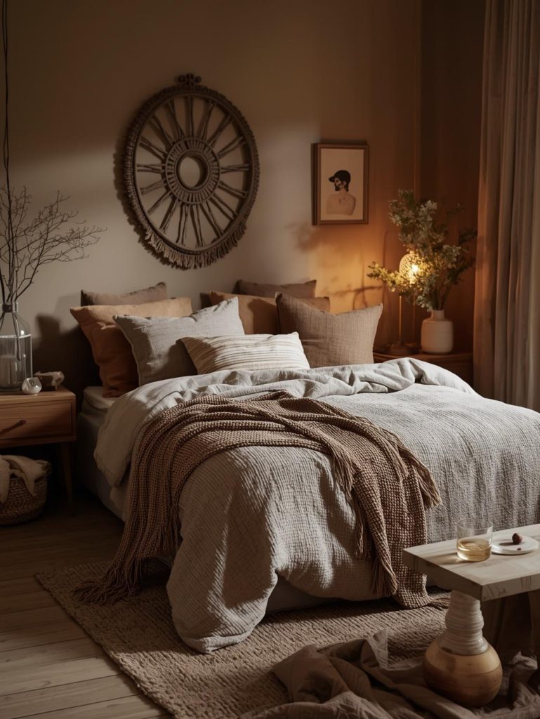 Soft lighting and natural fabrics enhance warmth. It’s perfect for creating a Pinterest-worthy bedroom that feels inviting and stylish.