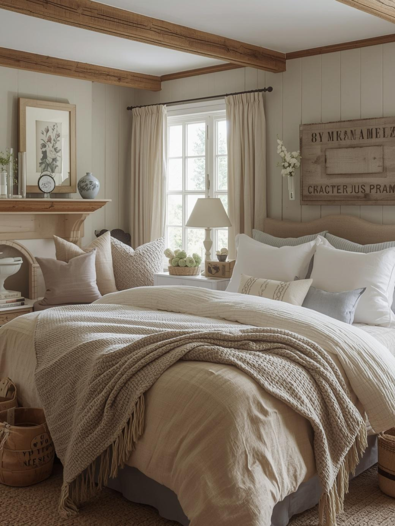 13. Rustic Neutral Farmhouse Bedroom