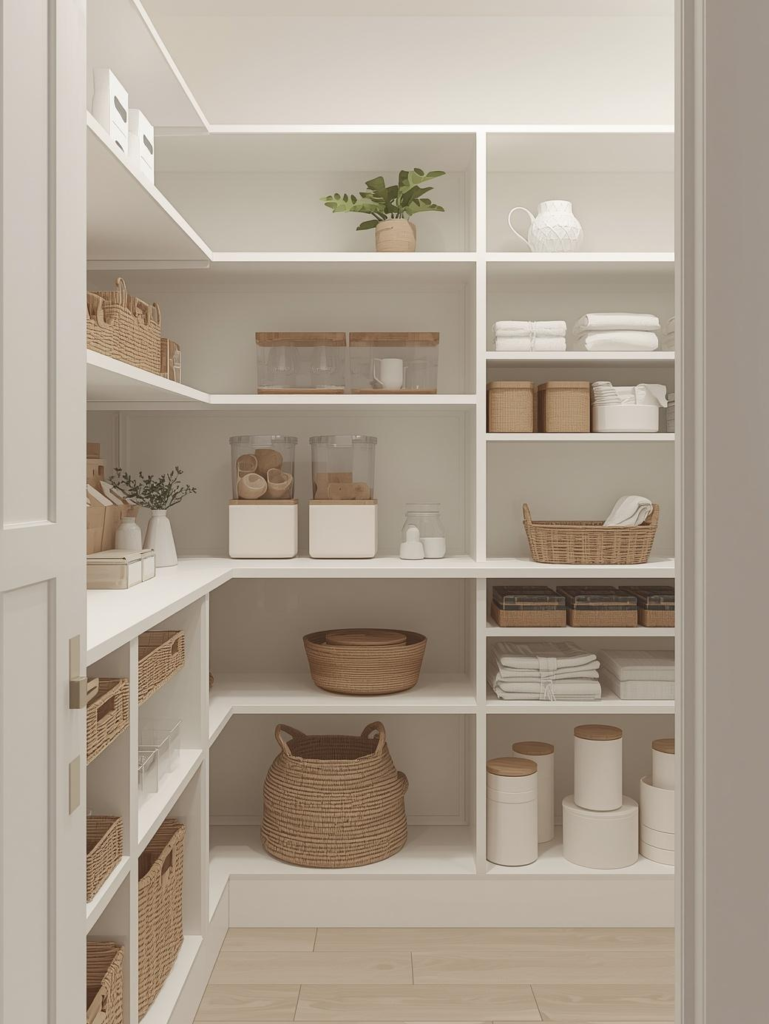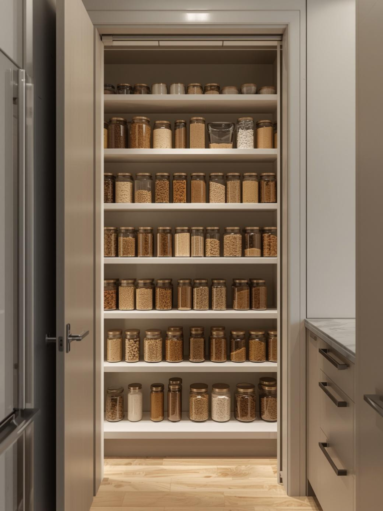 To enhance the look, use matching jars, baskets, or bins for a cohesive aesthetic. Keeping similar items grouped together also improves organization. This idea works especially well in tight spaces where every inch counts, transforming your pantry into a sleek and functional storage zone.