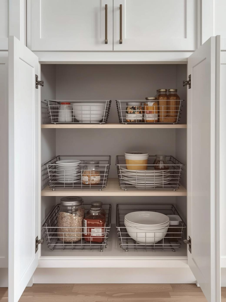 This solution is particularly useful in narrow pantries where depth is limited. It maximizes space while preventing clutter. Adding dividers creates a more structured and efficient storage system that makes your pantry feel organized and intentional.
