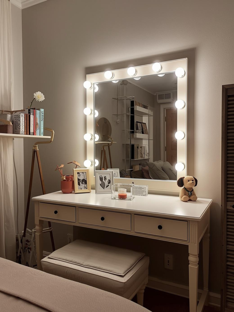 Place the mirror near natural light or above a dresser for best effect. Gold, black, white, or wood finishes match most teen room themes. This easy makeover helps create a polished bedroom look while adding cozy brightness and personality.