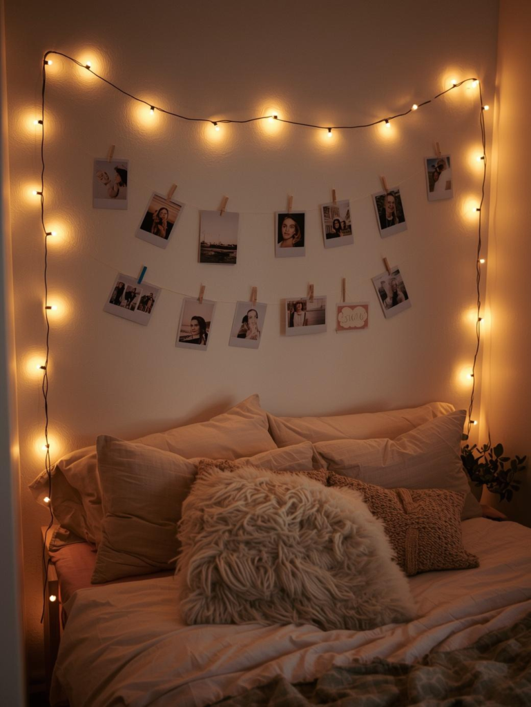 Choose warm white lights for a soft relaxing vibe or colorful lights for playful energy. Arrange the photos in rows, heart shapes, or random clusters depending on your style. This DIY decor works perfectly above a bed, desk, or reading nook. It adds personality while creating the comforting glow every cozy bedroom needs.