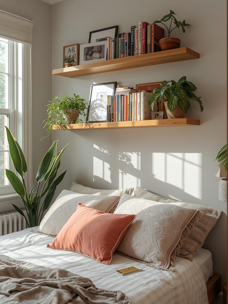 Floating shelves are perfect for adding storage while decorating walls in a stylish way. Install simple wooden shelves above a desk or dresser, then decorate them with books, candles, framed prints, and small plants. Shelves keep clutter organized while making the room feel curated.