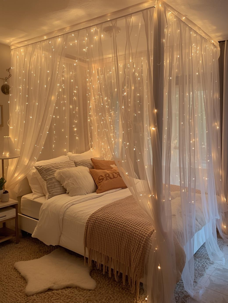 Add fairy lights around the canopy for a magical glow at night. Choose white for a clean style or soft blush and beige tones for extra warmth. This DIY room decor idea feels high-end but can be created on a budget using affordable materials.