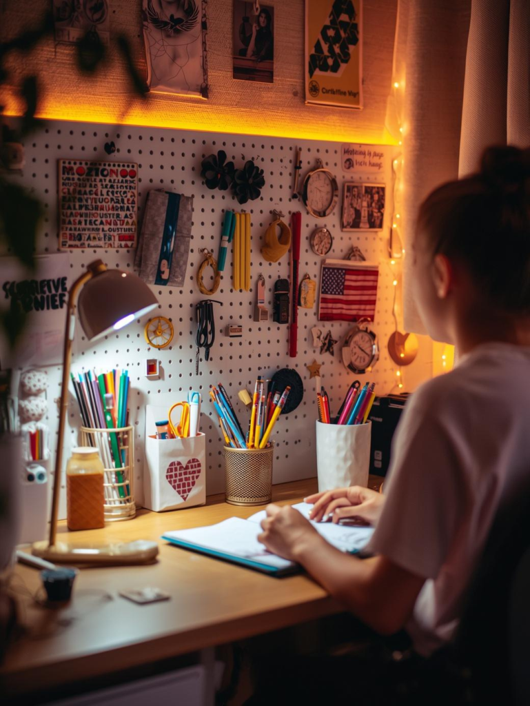 Paint the pegboard in a trendy color like black, white, sage, or pastel blue. Arrange items neatly for a Pinterest-inspired display. This cozy DIY project turns clutter into decoration and makes homework areas feel more organized, productive, and visually pleasing.