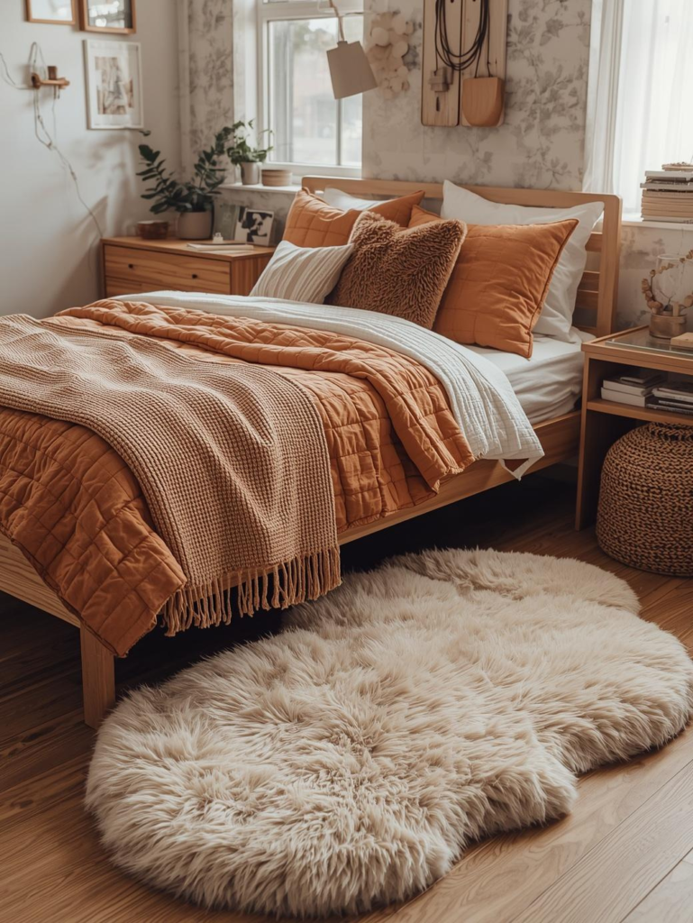 A soft rug can instantly make a room feel warmer and more comfortable. Place a fluffy rug beside the bed so mornings start with softness underfoot. Rugs also help define areas like reading corners or desk zones in larger bedrooms.