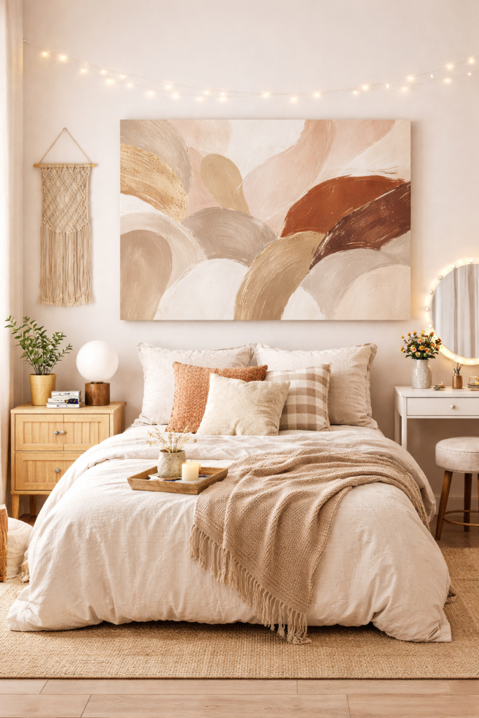 Blank walls can feel cold, but handmade canvas art instantly adds warmth and personality. Buy inexpensive canvases and paint simple abstract shapes, calming landscapes, or bold geometric patterns. Use colors that match the room palette so the artwork blends naturally into the space.