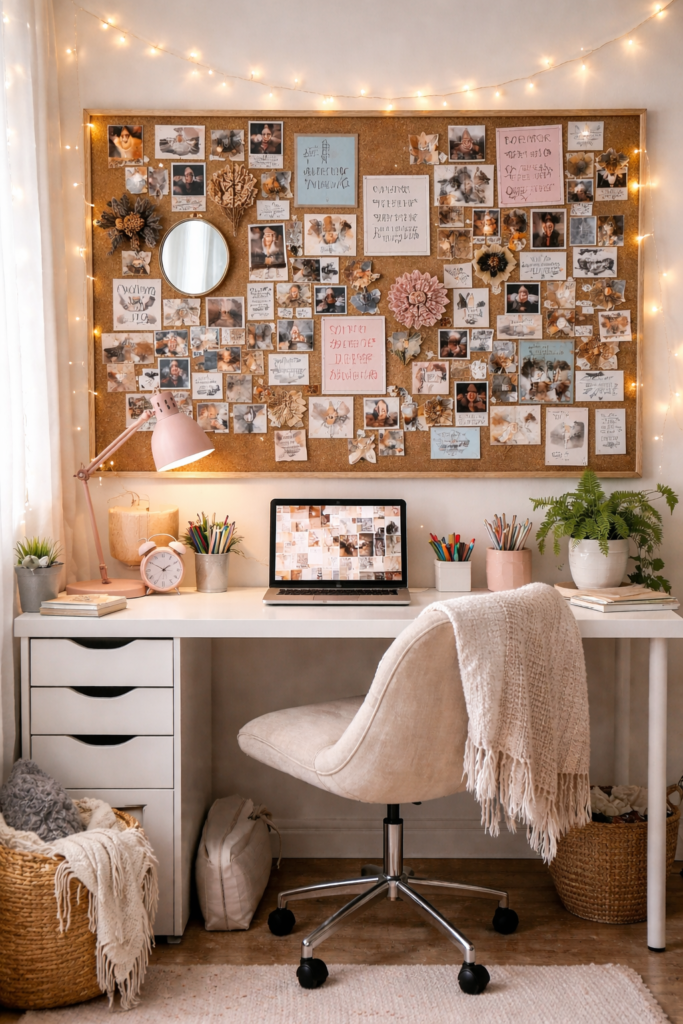 Create a custom bulletin board using cork tiles or fabric-covered boards arranged on the wall. Use it to pin schedules, goals, photos, and favorite quotes. This adds personality while keeping important notes visible and organized.