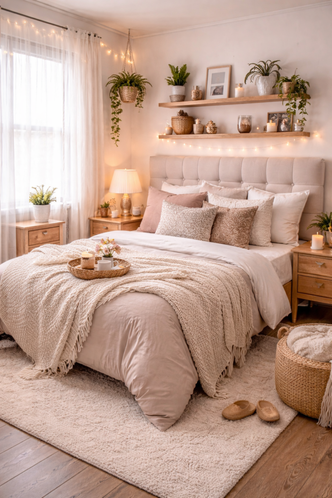A bed canopy instantly creates a dreamy and cozy bedroom atmosphere. Use sheer curtains hung from a ceiling hook or curtain rod to frame the bed beautifully. The soft fabric adds texture and makes the sleeping area feel private, calm, and luxurious.