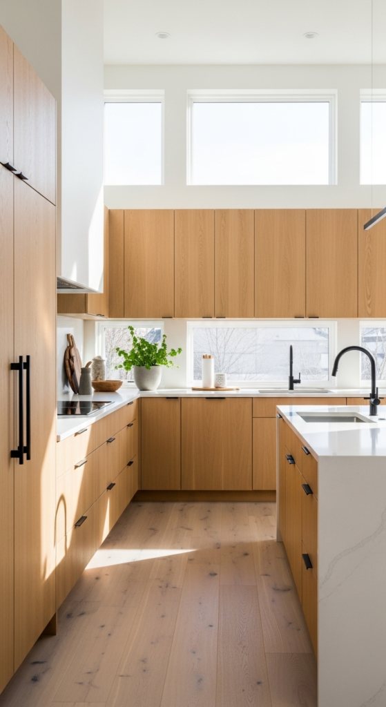 Light oak cabinets remain one of the biggest kitchen trends because they make spaces feel airy, calm, and effortlessly stylish. Their pale natural tone reflects light beautifully, making smaller kitchens feel larger and more open. The visible wood grain adds warmth without overpowering the clean modern design.
