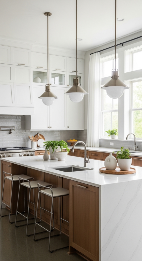Two-tone kitchens featuring white uppers and wood lowers continue trending strongly in 2026. This combination keeps the room bright while adding grounding warmth below eye level. It feels custom, balanced, and highly designer-inspired.
