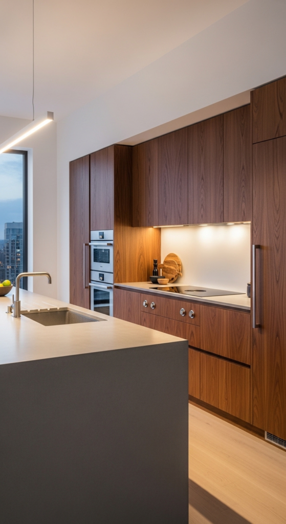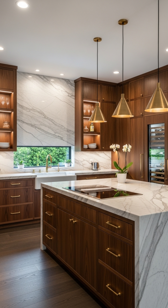 Rich walnut cabinets instantly create a sophisticated, high-end kitchen look. Their deep brown tone and dramatic grain patterns feel elegant and expensive, making them ideal for statement kitchens. Walnut brings warmth while still feeling polished and modern.
