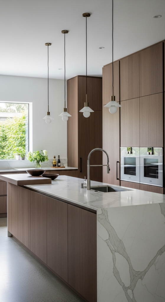 Handleless designs or slim edge pulls enhance the sleek appearance. These cabinets pair well with concrete, quartz, or waterfall islands. In 2026, many homeowners love this style because it avoids ornate details while still feeling rich and natural.