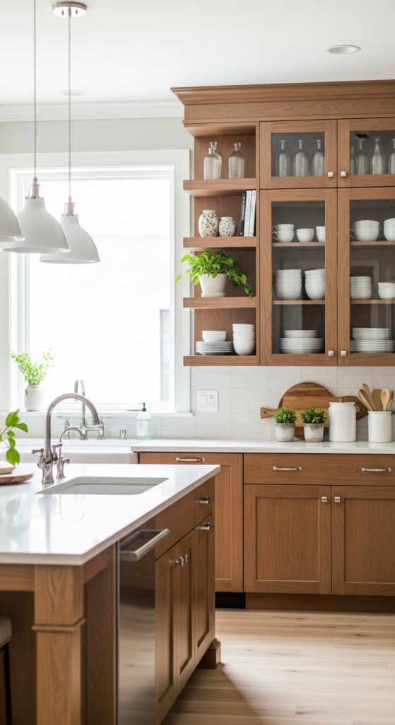 Wood cabinets mixed with glass-front doors create a lighter more decorative kitchen design. Glass uppers break up heavy cabinetry while allowing styled dishes and decor to show. This combination feels custom and elegant.