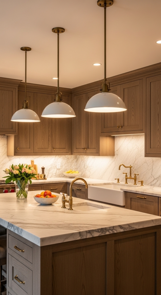 These cabinets look stunning with marble surfaces, brass accents, and creamy walls. They are especially popular in larger kitchens where the darker finish can shine without making the room feel too enclosed. Integrated lighting enhances the richness beautifully.