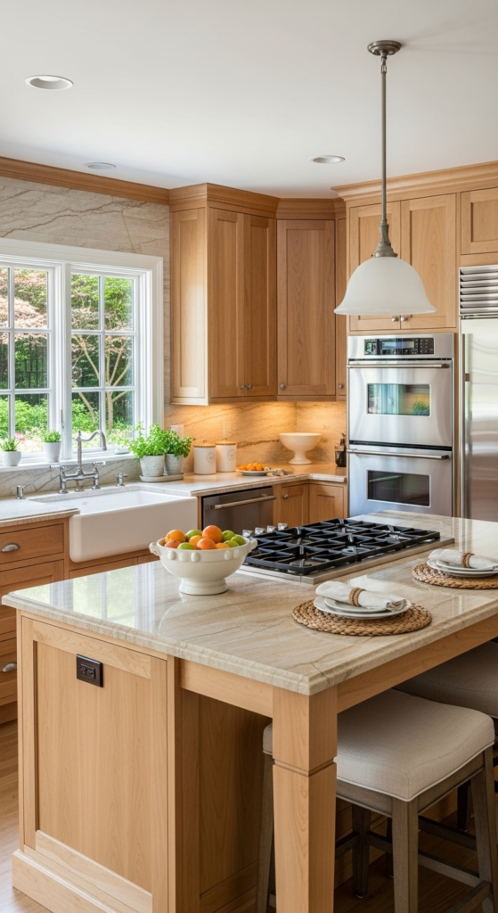 Pair maple cabinetry with warm stone counters, brushed nickel hardware, and soft cream walls. The gentle tone brightens the room while still adding noticeable warmth. It is especially appealing for homeowners wanting timeless wood without going too dark.