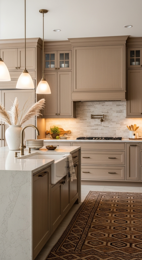 These cabinets pair beautifully with travertine, creamy quartz, and matte hardware. They are ideal for homeowners who want warmth without strong yellow or dark brown undertones. The subtle color feels current and timeless.