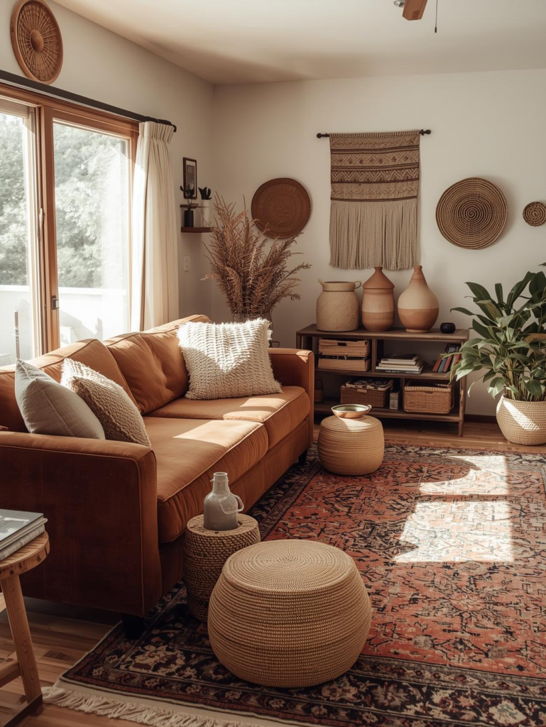 Earthy decor pairs beautifully with a brown couch, creating a grounded and natural living room aesthetic. Shades like olive green, rust, terracotta, and warm beige enhance the couch’s warmth and make the space feel welcoming.