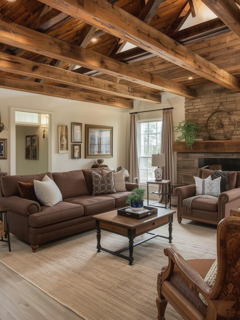 A brown couch fits naturally into rustic living rooms. Paired with wood beams, distressed furniture, and cozy textiles, it enhances the warm, lived-in feel of the space.