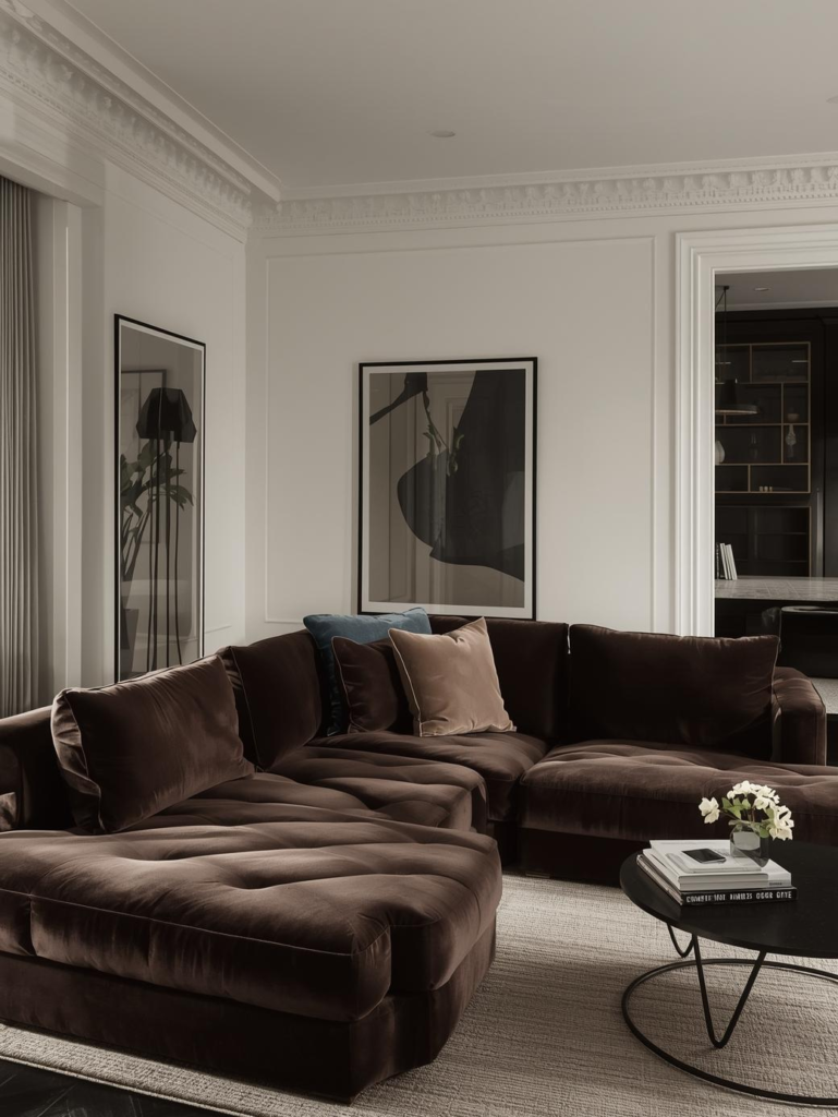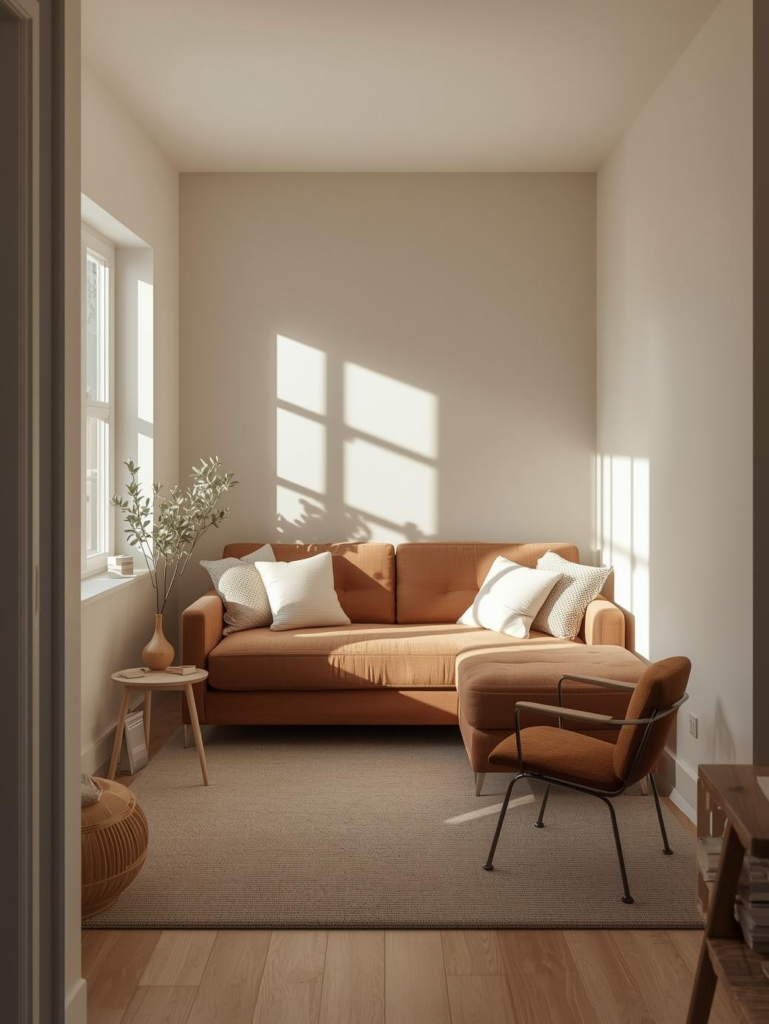 Add subtle contrast with light wood or gold accents for warmth. The combination feels elegant, cozy, and ideal for smaller living rooms where maintaining brightness is essential.