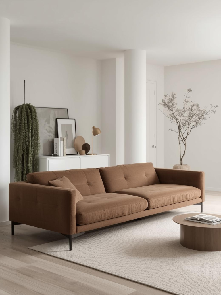 Minimalist styling allows a brown couch to shine without distraction. Neutral walls, simple furniture, and limited decor keep the focus on clean design and balance.