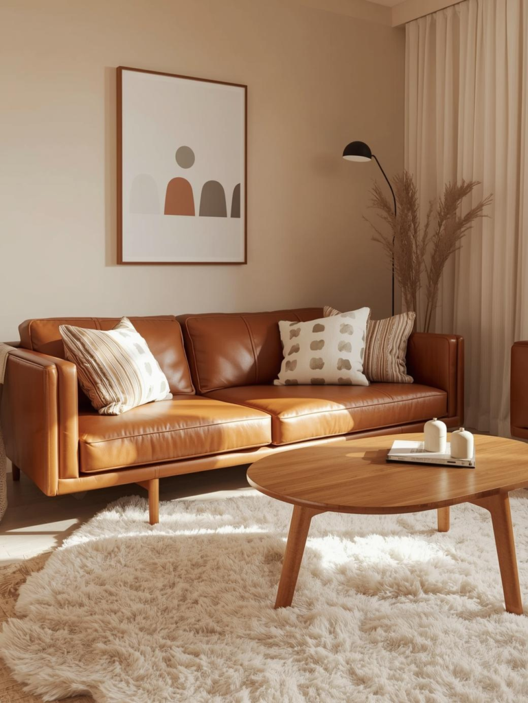 A brown leather couch instantly adds richness and sophistication to a living room. Pairing it with neutral tones like beige, cream, or soft gray helps balance the darker color while keeping the space light and inviting. This combination feels timeless and works well in both modern and classic interiors.
