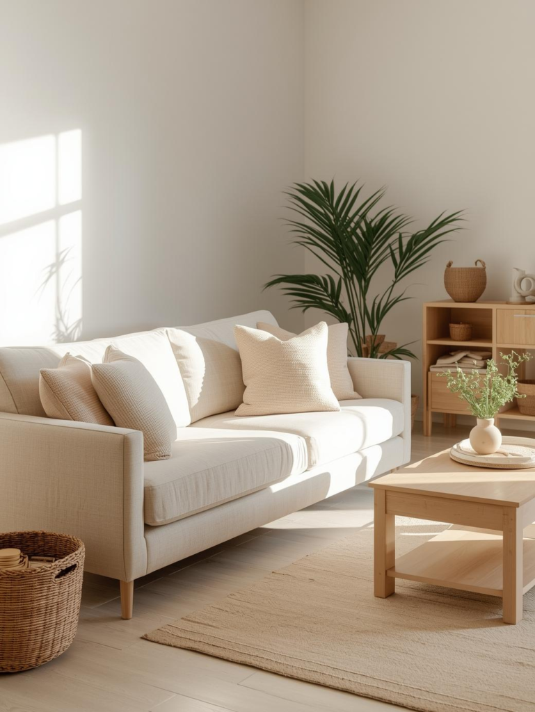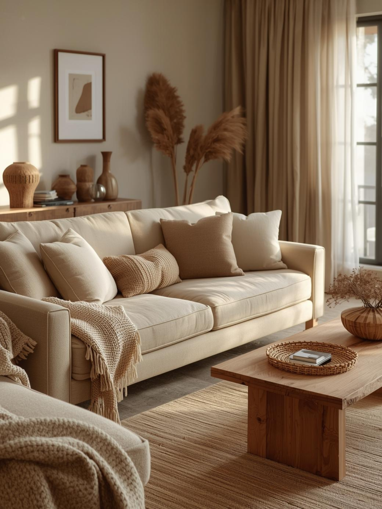 An earthy neutral boho living room focuses on calm shades like beige, sand, cream, and taupe to create a soothing environment. These soft tones make the space feel open and airy while allowing natural textures to shine. Wooden furniture, linen sofas, and woven rugs work together to form a relaxed foundation that feels timeless and welcoming.