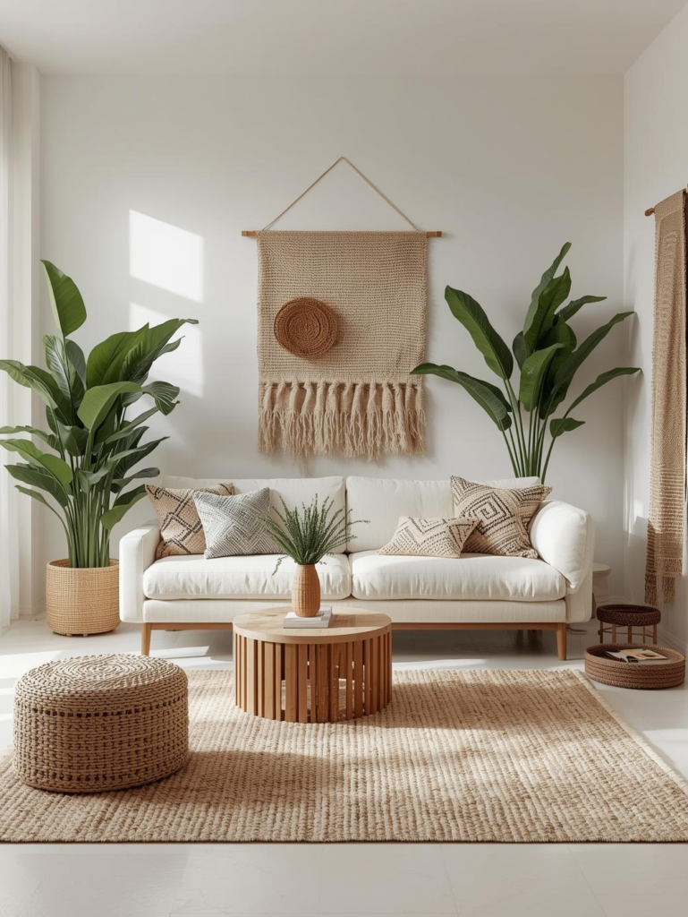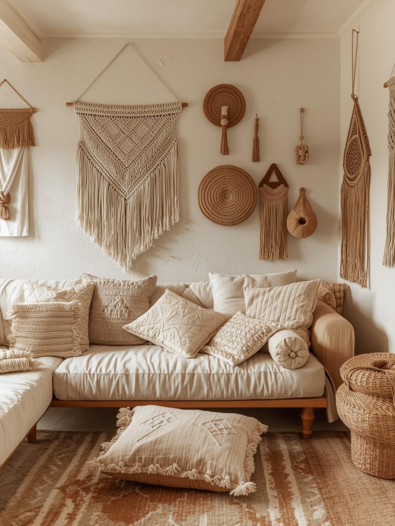 A neutral textured boho living room relies on texture rather than bold colors to make an impact. Elements like macrame wall hangings, woven cushions, and textured walls add depth while maintaining a calm color palette. This approach keeps the space elegant and visually rich.