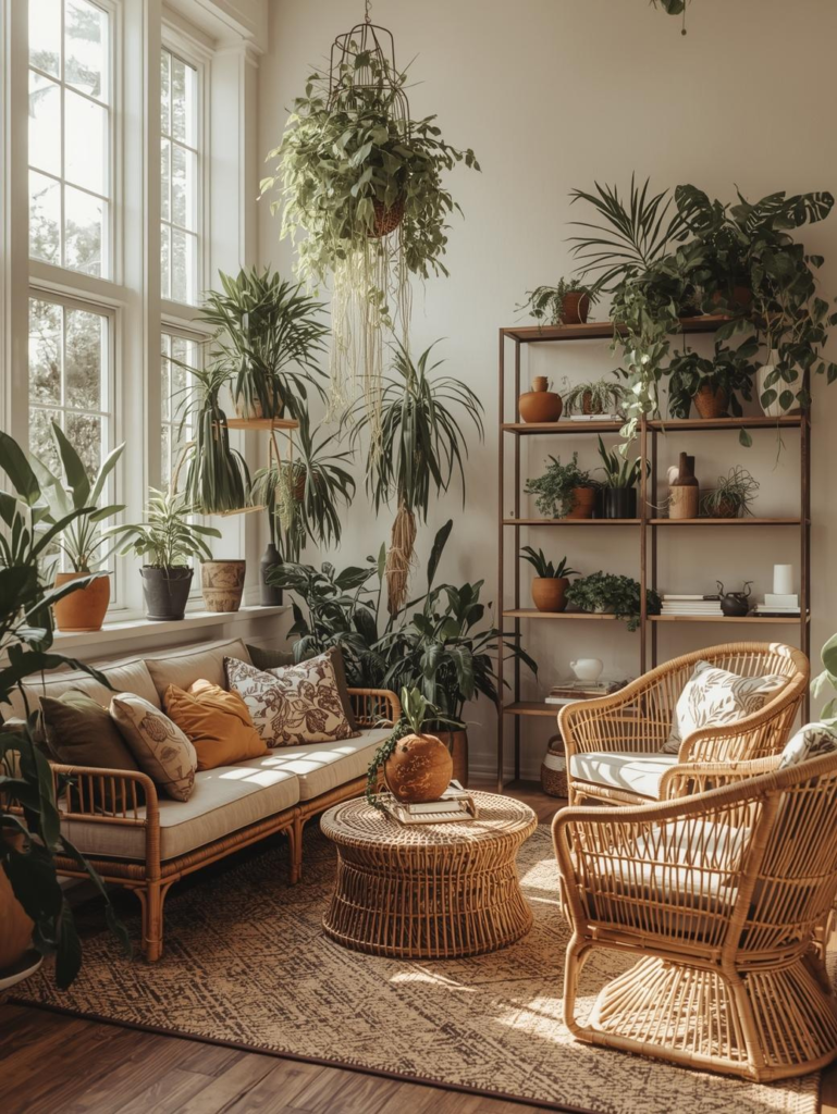 Indoor plants are a core element of boho living room decor, bringing life and freshness into the space. Large leafy plants, hanging planters, and small potted greenery instantly soften the room and create a calming atmosphere. Plants also pair beautifully with natural materials like wood and rattan.