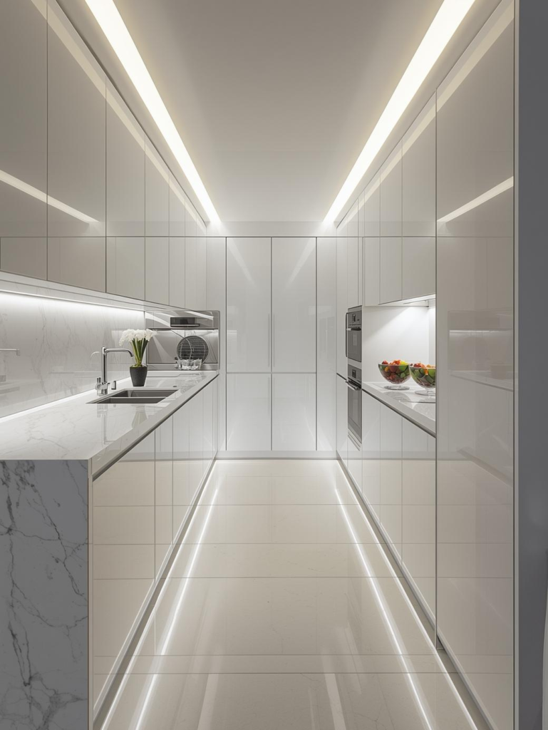 While they require regular cleaning, the visual payoff is worth it. Pair glossy counters with simple cabinetry to keep the look sleek and uncluttered. This style works beautifully in contemporary homes.
