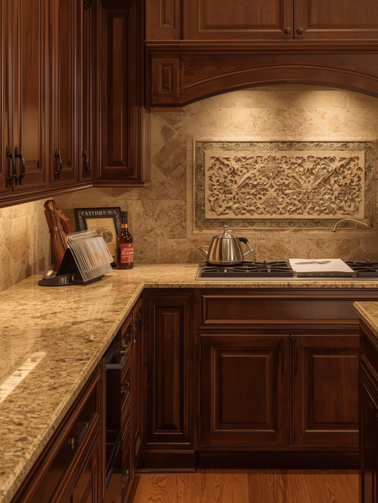 Beige stone counters create a soft, calming kitchen environment. They blend effortlessly with warm wood cabinets and neutral color palettes, making them ideal for cozy modern or classic kitchens. This subtle countertop choice adds elegance without overpowering the space.