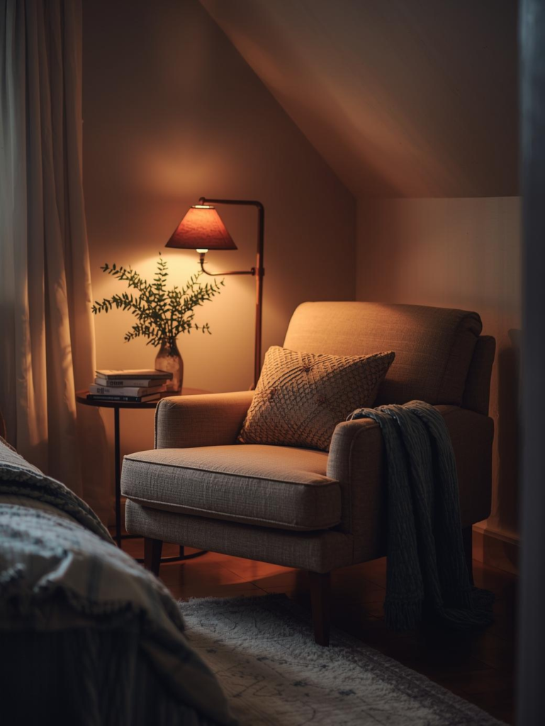 To enhance the reading corner, warm ambient lighting is essential. A floor lamp or wall-mounted reading light provides gentle illumination without disturbing the cozy vibe. Minimal decor, such as a small side table and a stack of books, keeps the space uncluttered. Natural textures and soft fabrics blend seamlessly, making the bedroom feel calm, personal, and perfectly Pinterest-worthy.