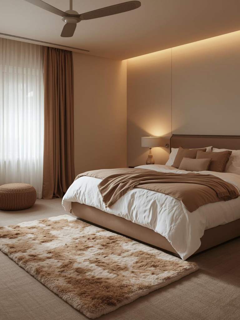 Warm colors help create a safe and relaxing bedroom environment. Shades like beige, taupe, and soft brown enhance comfort and warmth.