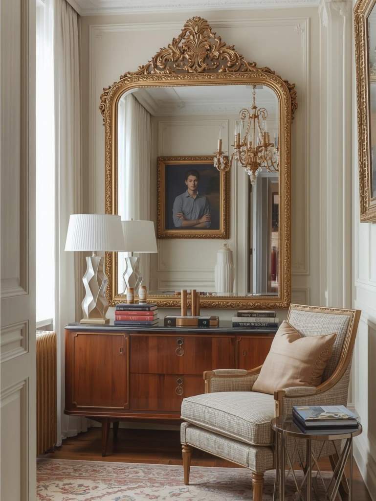 Mirrors are one of the most powerful tools for making a small space feel larger. A large statement mirror not only reflects light but also creates depth, giving the illusion of more square footage. Choosing a stylish frame—like gold, black metal, or vintage wood—adds a touch of luxury without requiring a big investment.