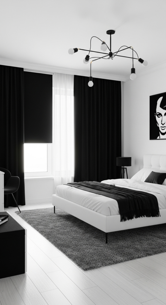Black blackout curtains can create bold contrast in a light-colored bedroom. Against white walls or cream bedding, dark curtains make the room feel modern and intentional. The contrast adds visual interest while maintaining a clean and polished appearance.