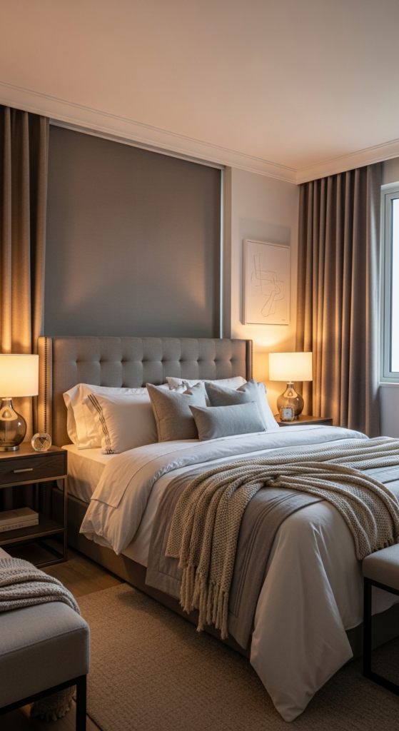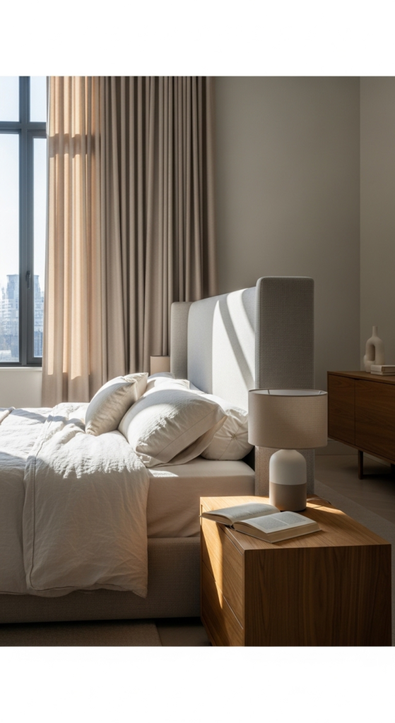 Floor-to-ceiling blackout curtains instantly make a bedroom feel taller and more refined. Hanging the curtain rod close to the ceiling creates the illusion of larger windows, making even smaller bedrooms feel more open. Neutral shades like beige, ivory, and taupe keep the look timeless while blending beautifully with modern interiors.