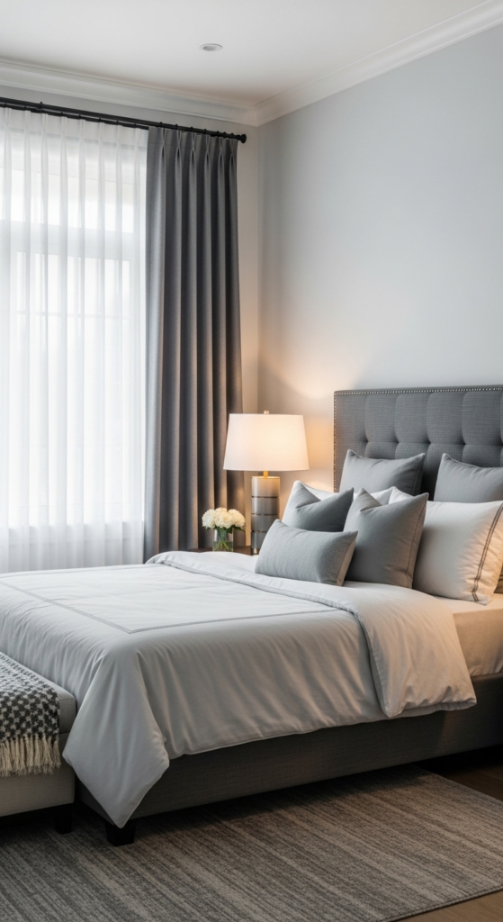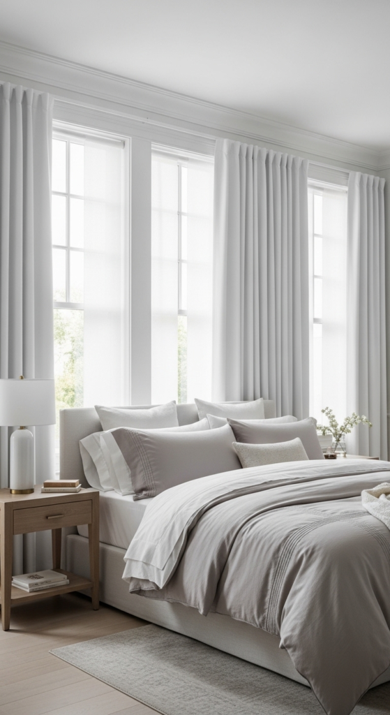 Layering sheer curtains with blackout panels creates a luxurious hotel-inspired bedroom. During the day, sheer curtains allow filtered sunlight to brighten the room while maintaining privacy. At night, the blackout layer can be closed to completely block outside light for a peaceful sleeping environment.