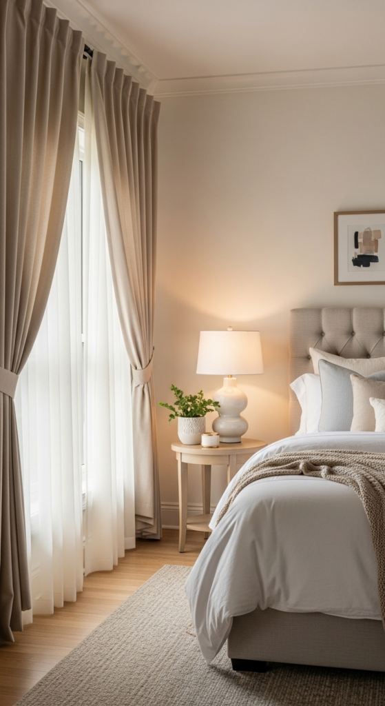 This setup offers flexibility for different times of day. In 2026, layered neutral curtains are popular for bedrooms that need both style and practicality.