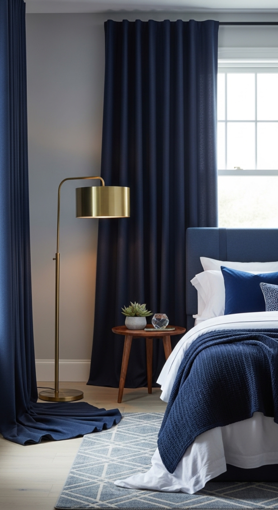 Navy pairs beautifully with gold, white, and wood finishes. In 2026, deep blue curtains remain popular for adding color while preserving a restful atmosphere.